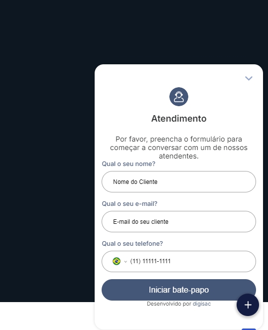 Essa será a visão do seu cliente. Após preencher os campos de contato, ele poderá "Iniciar o atendimento".