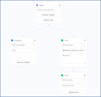 Dentro dos gatilhos, encontrará as regras, elas definem as condições e as ações do robô. As condições definem o que precisa ser feito para que o robô realize as ações. Alguns dos principais exemplos são: condição dentro e fora do horário de atendimento, condição de texto de mensagem; ações como envio de mensagem, transferências e definição de contextos.