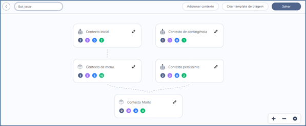 Em resumo, os contextos são como etapas de atendimento, dentro deles, serão definidas todas as regras que o robô realizará durante a interação com o contato. Dentre os principais, temos: o contexto inicial, contexto persistente, contexto de menu, contexto de contingência, contexto morto.