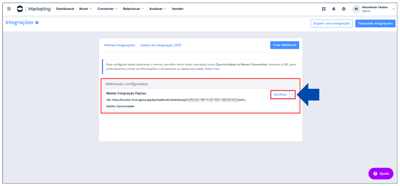 5. Com o Webhook criado, é possível checar se a integração está funcionando corretamente ao clicar em **Verificar**.