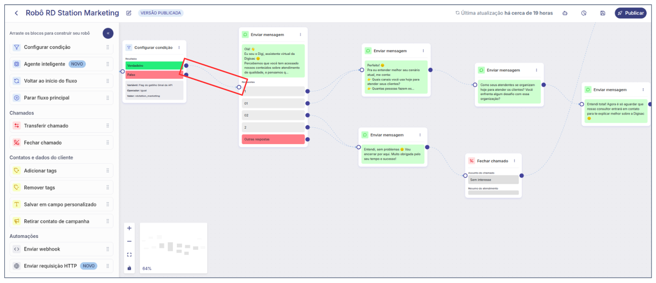Pronto! A configuração do robô na Digisac foi concluída. Agora, prossiga para a **Etapa 2 — Configuração na RD Station Marketing**.
