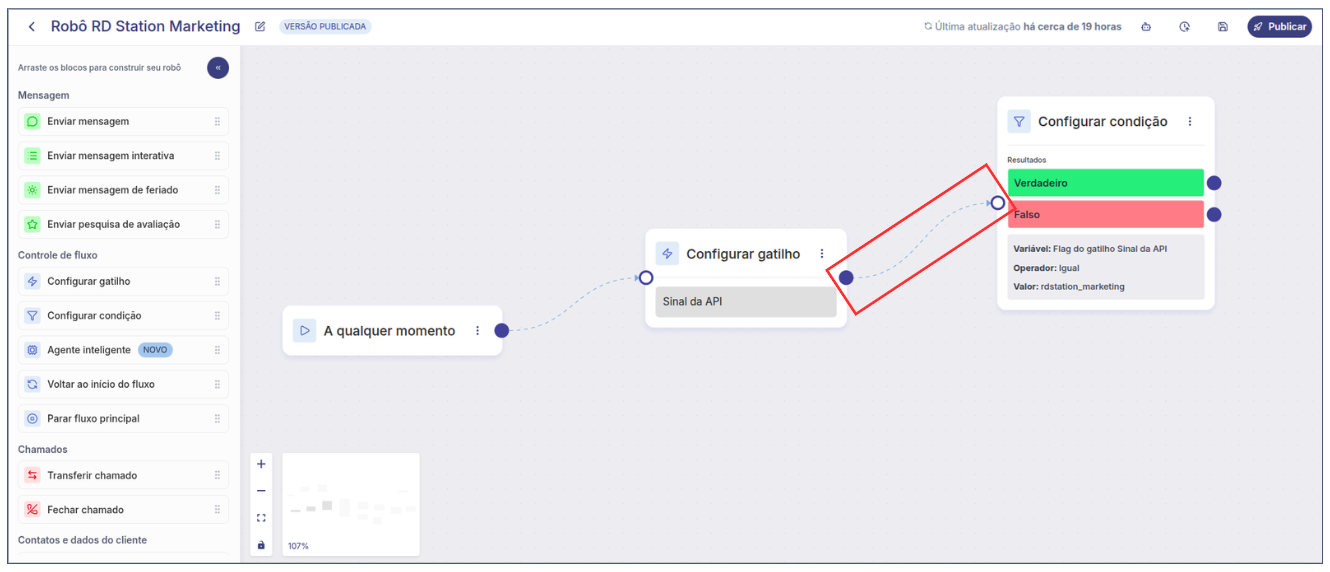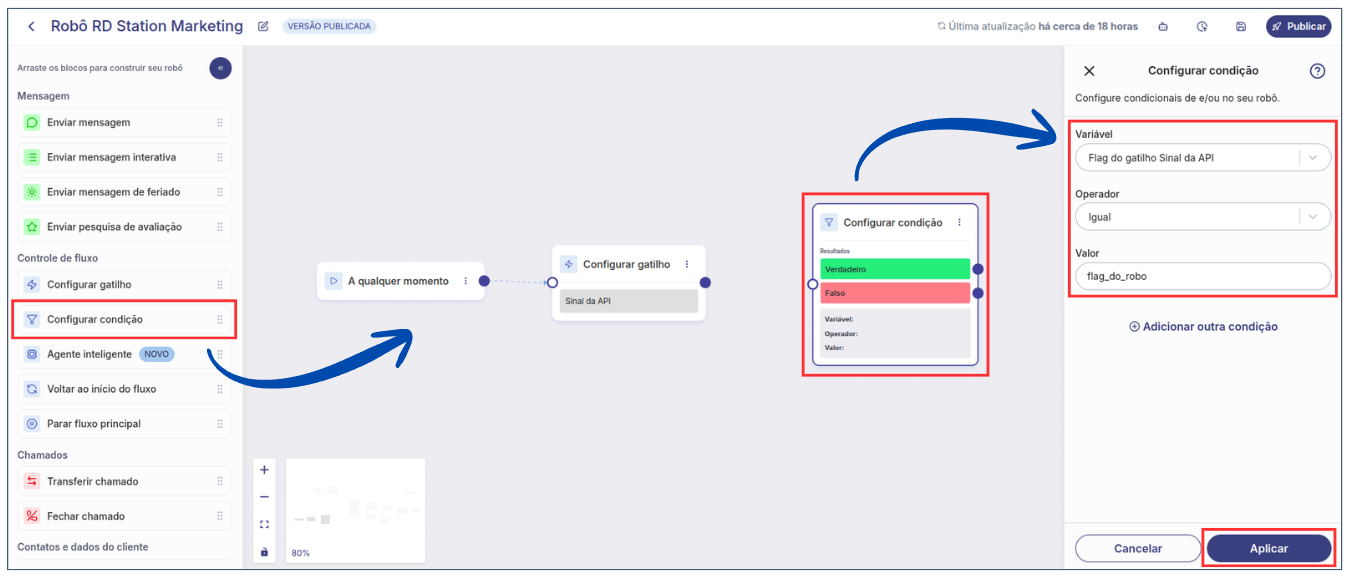 8. A partir da saída **Verdadeiro** do bloco **Configurar condição**, crie o fluxo desejado do robô ou conecte-o a um fluxo já existente.