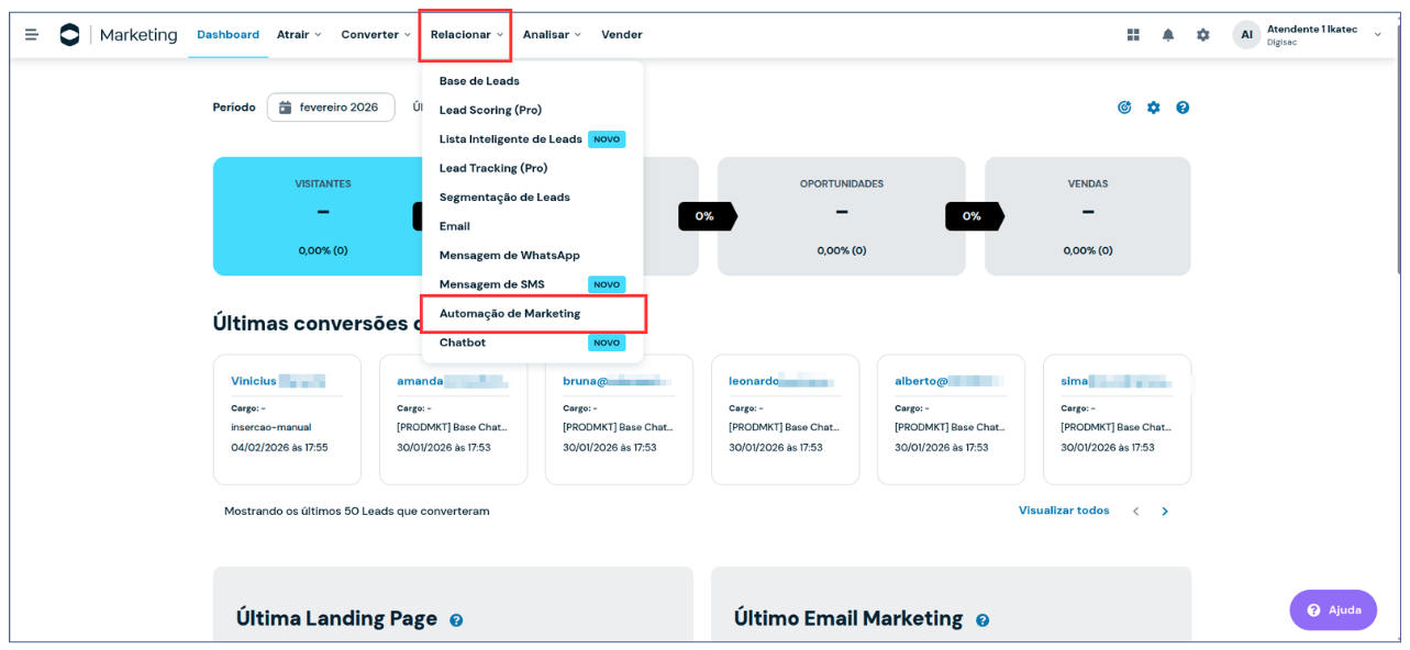 1. Na RD Station Marketing, acesse o menu superior e selecione **Relacionar** > **Automação de Marketing.**