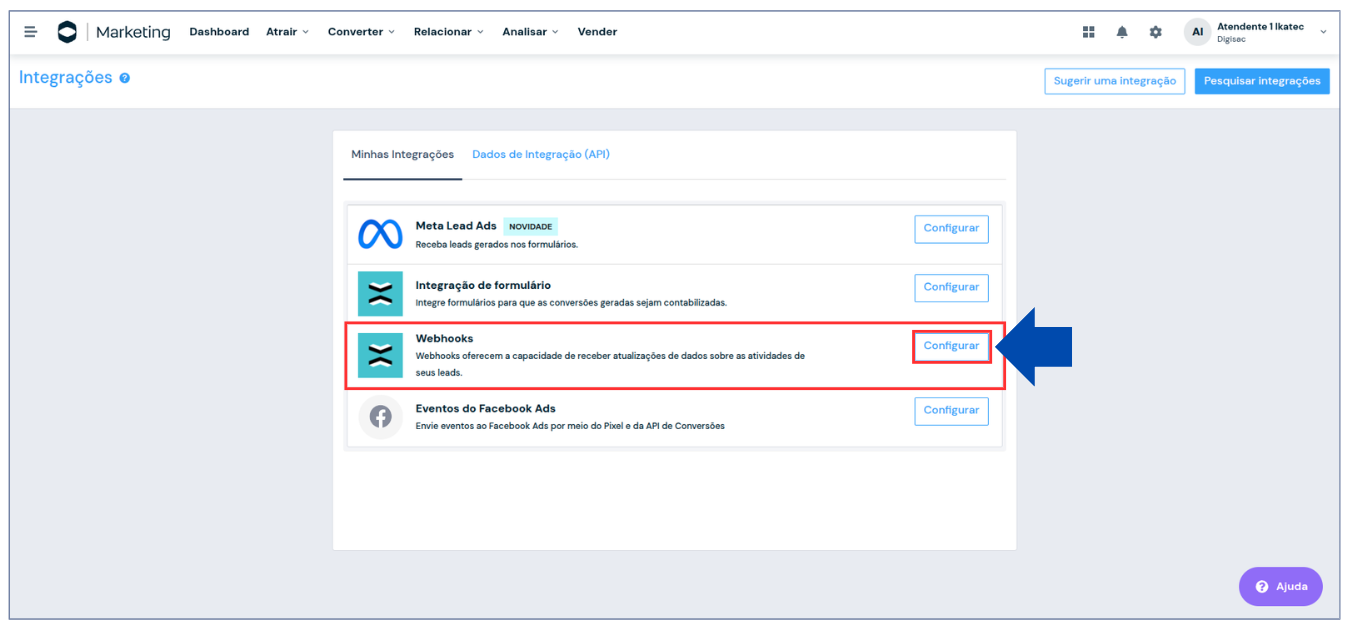 2. Na tela de integrações, selecione **Webhooks** e clique em **Configurar**.