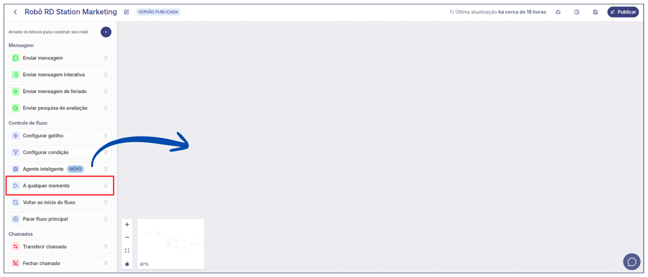 3. No **Editor do Robô**, localize o bloco **A qualquer momento** e arraste-o para o fluxo.