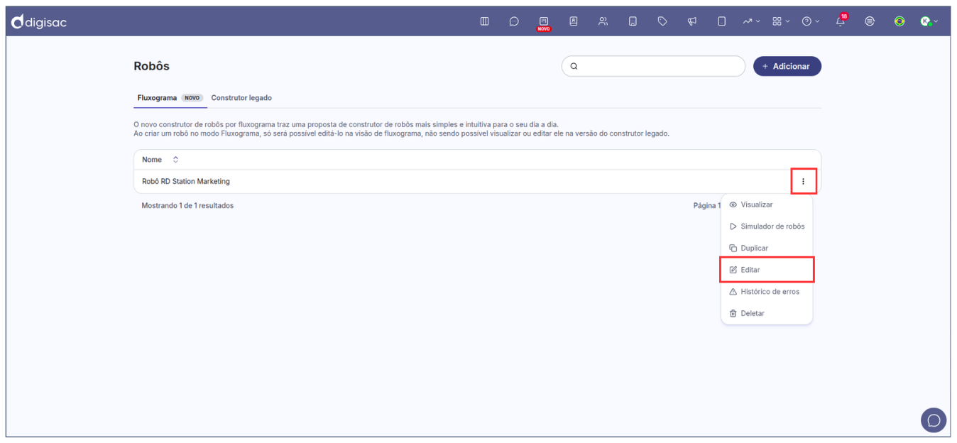 2. Localize o robô que será utilizado na integração. Clique nos **três pontinhos** ao lado dele e selecione **Editar**.