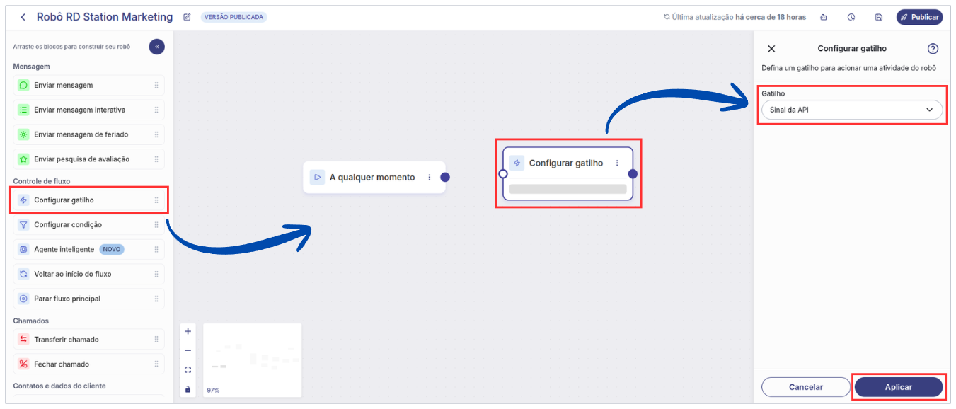 * Clique no bloco para abrir a configuração na lateral direita. Em **Gatilho**, selecione **Sinal de API**. Clique em **Aplicar** para salvar a configuração.