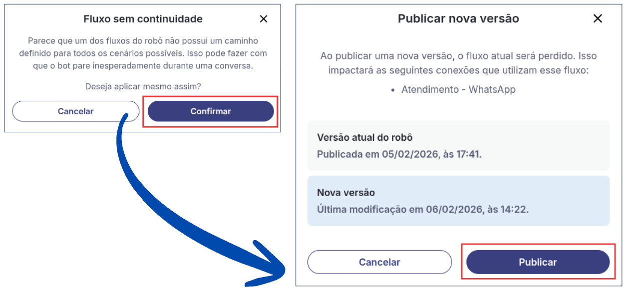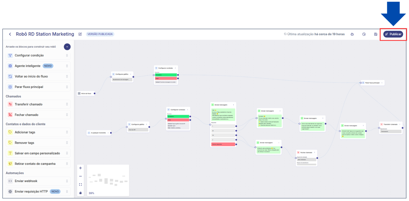 9. Após finalizar todas as configurações do robô, clique em **Publicar** > **Confirmar** e em seguida, em **Publicar** novamente para salvar as alterações.