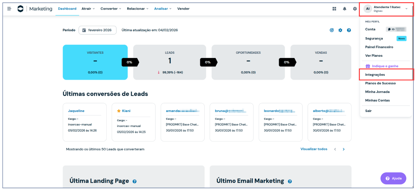 1. Na RD Station Marketing, clique no **Menu do Usuário** e acesse **Integrações**.