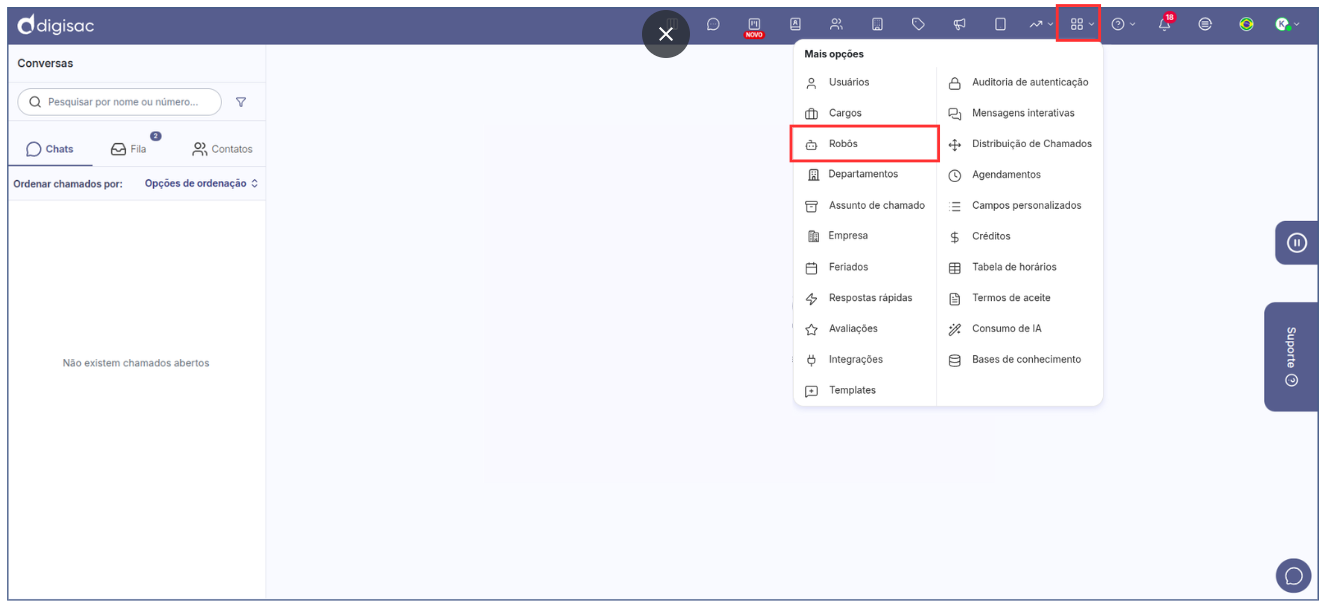 1. No **Menu Principal** da Digisac, clique em **Mais Opções** e selecione **Robôs**.