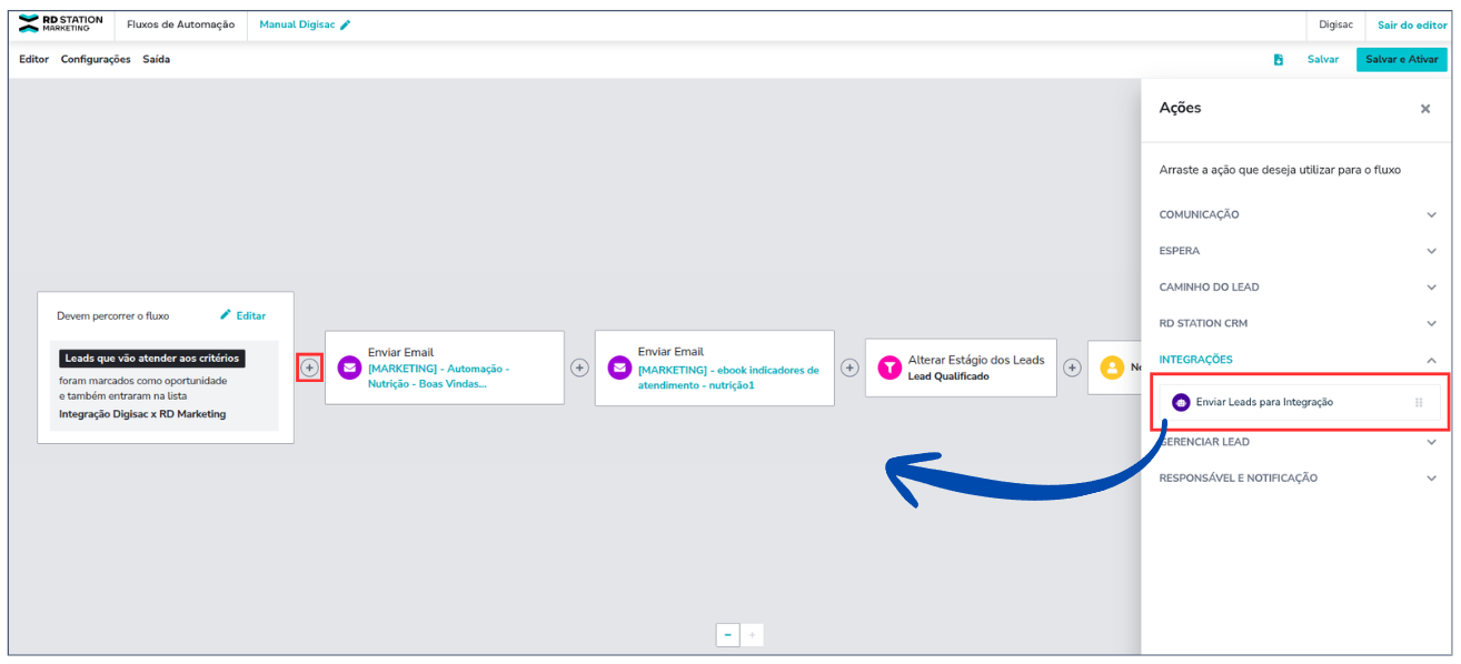 4. Na seção **Integrações**, arraste a ação **“Enviar Leads para Integração”** para o fluxo (no **+** onde deseja que ele seja inserido).