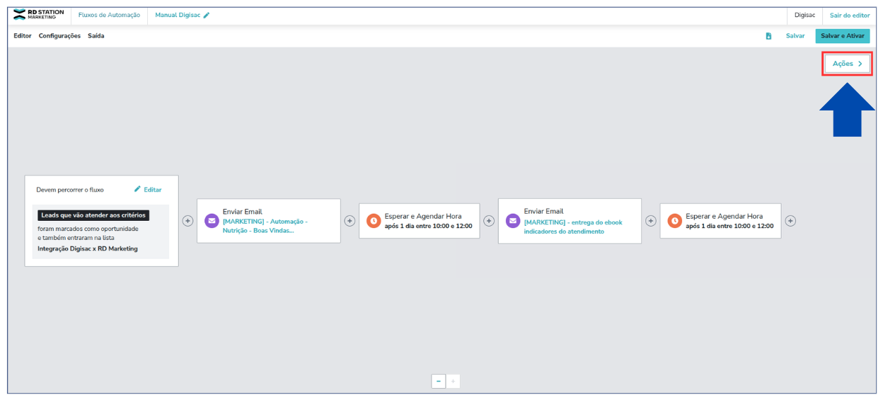3. No editor do fluxo, clique em **Ações**.