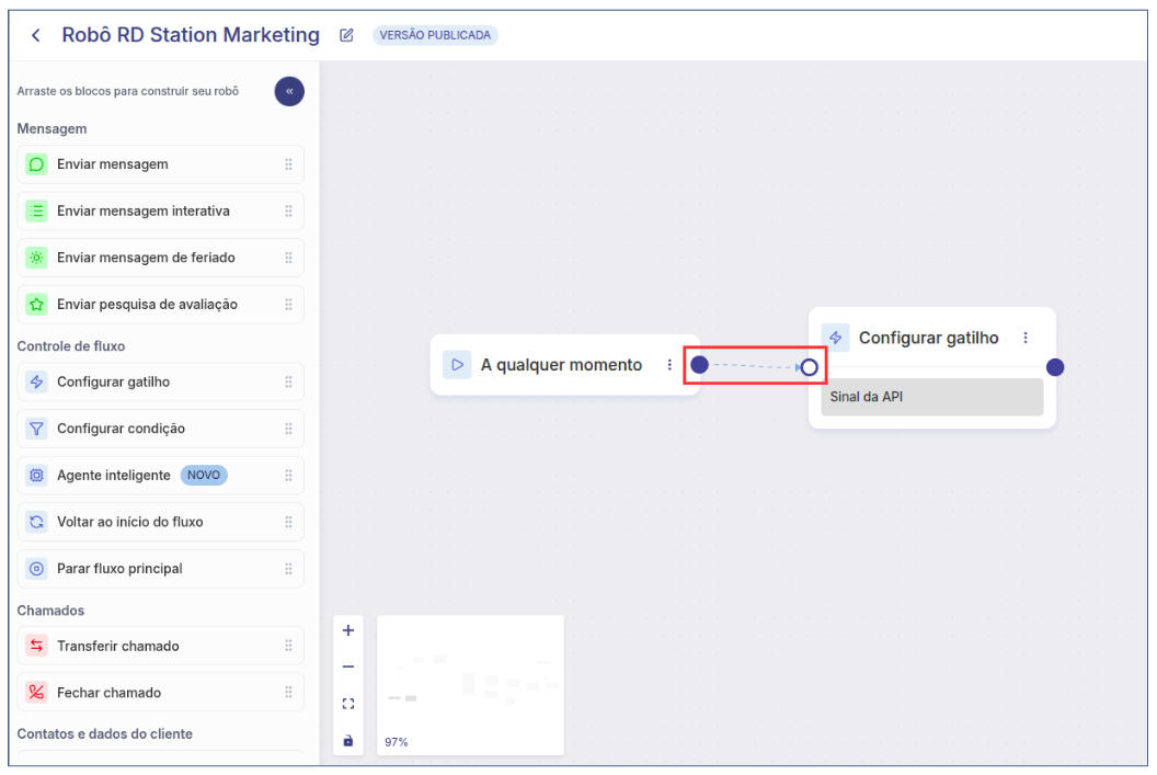 Pronto! Com as duas etapas configuradas, sempre que o gatilho for disparado na RD Station, o evento será enviado automaticamente para a Digisac. Com isso, o robô será acionado e seguirá o fluxo de atendimento previamente configurado.